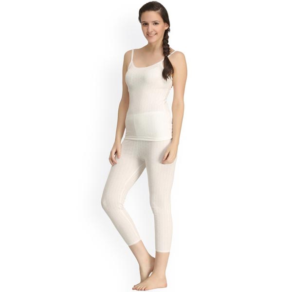 Off-white mid-rise thermal three-fourth leggings in a patterned weave, has an elasticated waistband