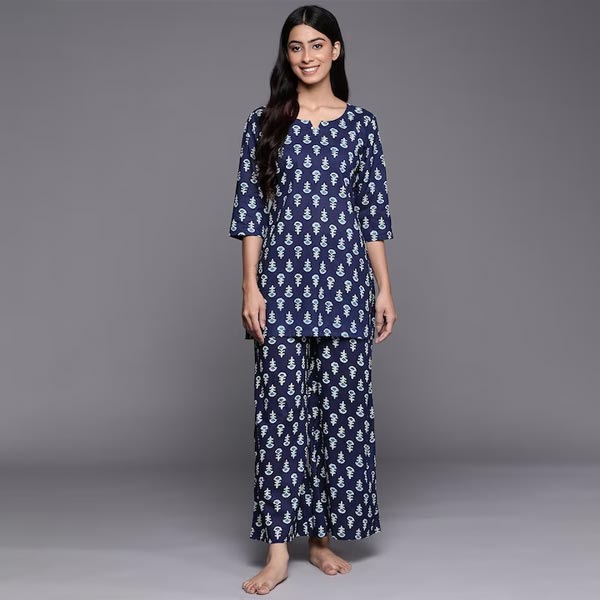 Women Navy Blue & White Printed Night suit